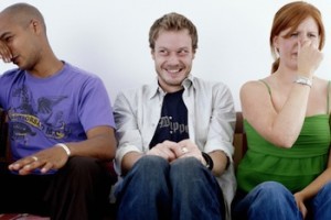 Young man, smiling, sitting between man and woman holding noses