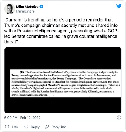 Meanwhile, when not completely ignoring the story, the MSM continues to peddle the totally discredited Russian collusion narrative as fast as Ben Shapiro can talk, as evidenced by this tweet from New York Times propagandist Mike McIntire: