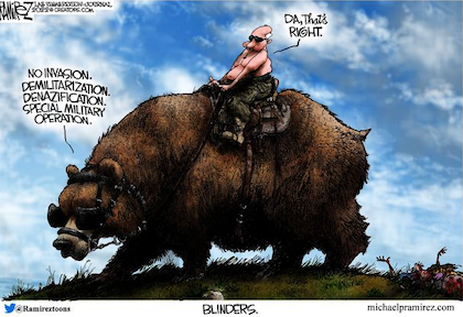 What the Russians currently are perpetrating in Ukraine is less a war than a mass murder, with Putin’s forces targeting residential buildings and a maternity hospital, among other civilian sites. The world has recoiled in disgust and contempt from Russia — from the Putin regime and the people who enable it — and though the Biden administration has not exactly exercised inspiring leadership in this, the actions of the country with the world’s largest economy and most powerful military inevitably stand out.