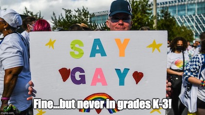 Let’s be clear on this: A law which prohibits exposure of children grades K-3 to sexual deviancy seeks to “erase” adult LGBTQRSTUVWXYZ employees at Disneyworld.