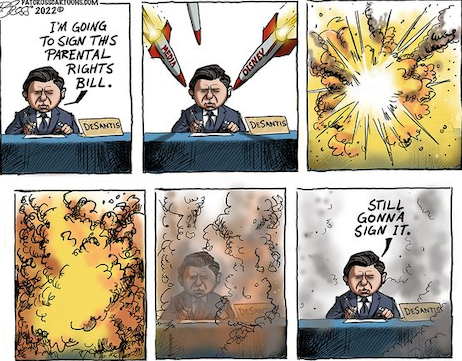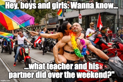 Let’s be even clearer on this: A law which prohibits exposure of children K-3 to sexual deviancy means a gay teacher can no longer, if you’ll forgive our graphic French, discuss oral and anal sex with kids who haven’t the faintest clue what sex is!!! Wow: What an infringement on his civil liberties!!! We’ll REALLY go out on a limb and affirmatively state a teacher’s personal life has no place whatsoever in the classroom at any level.