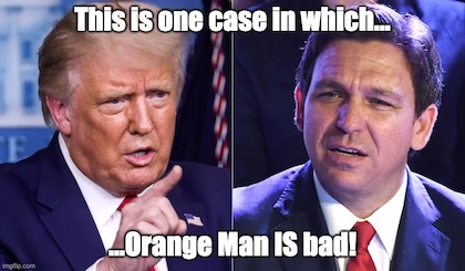 In 2022, Trump says that DeSantis owes him, and invites DeSantis, with Trumpian repetition, to support Trump for 2024. DeSantis has declined the invitation and Trump, in turn, has declined to support DeSantis for election this year, after endorsing, among other notables, Dr. Oz, Mo Brooks, and Herschel Walker.