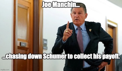 Which means Manchin, who’s not stupid, knows his deal is completely counterproductive to its purported purpose. Which means he knows it can only increase and prolong the economic pain average Americans are currently suffering. Which means, were Manchin to answer honestly when faced with these facts, he could only respond: