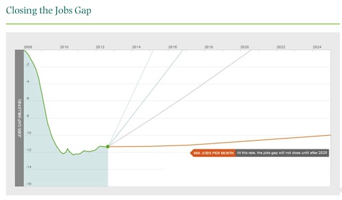 – Each month, The Hamilton Project examines the “jobs gap” — the number of jobs that the U.S. economy needs to create in order to return to pre-recession employment levels while also absorbing the people who enter the labor force each month. If we added 96,000 jobs every month, we would not close the jobs gap until after 2025, as this chart shows.