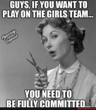 Three thoughts immediately come to mind: (i) That last statement’s both baseless and biased, but if it were a men’s issue, we’d recommend either a hysterectomy, not competing or just dealing with it as three quick and easy solutions; (ii) This is yet another reason mentally-ill men should not be allowed to compete with women; and (iii) We’re going to save everyone a lot of time and money by definitively deciding the impact is adverse.