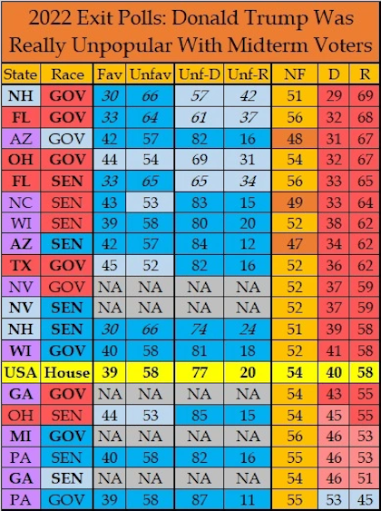 The 2022 midterms were about as decisive a failure for Trump as it was possible for them to be. Consider, as one item of evidence, the exit polls. Exit polls are not perfect; even though they should have the advantage over other polls of polling only people who actually voted, they still have their known biases and shortcomings. Still, they are the only evidence we get of who voted for whom and why at the time of the actual election, and when they deliver messages in bold, screaming letters, we should listen.