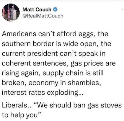 (6). Writing at the Weekend Jolt, Judson Berger offers the prescient warning we haven’t heard the last of the stove banners., which his NRO colleague Jack Crowe described as a “a gun grab for people who like to cook.” Here’s the kicker: The banners have no plan WHATSOEVER how to generate the electricity to power the electric appliances which will replace those powered by the cleanest burning, most plentiful fuel on the planet. As this meme forwarded by Hickey points out: