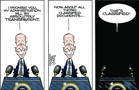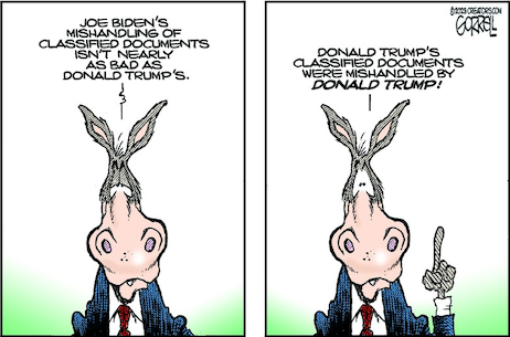 (3). The DOJ’s conduct in Docugate has been so egregious even the even-handed Andy McCarthy is suggesting Merrick’s Marauders be indicted for felony mishandling of classified documents, seeing as they put partisan politics above national security in deciding, as the Journal reported Tuesday, “Biden aides without security clearances, rather than the FBI, should conduct searches virtually certain to turn up classified documents.” When the title of an Andy McCarthy commentary uses a term like “gross negligence” to describe the actions of the Attorney General of the United States, it’s for very specific reasons and with clear intent.