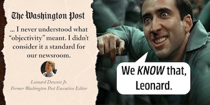 “The Washington Post’s former executive editor, Leonard Downie Jr., who is currently a professor at the Walter Cronkite School of Journalism and Mass Communication at Arizona State University, asserts that newsrooms need to move beyond objectivity. Downie ridiculously claims that journalists can eschew objectivity and still build trust.