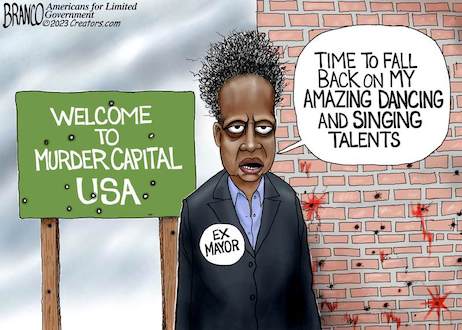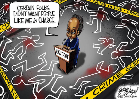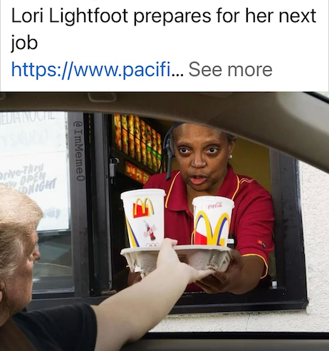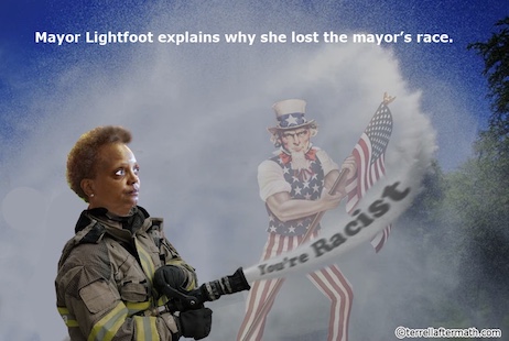 As Tucker explains her convoluted logic, evil MAGA racist Republican supporters of The Donald are responsible for the former supporters or the first female Black lesbian mayor or Chicago refusing to REelect her!