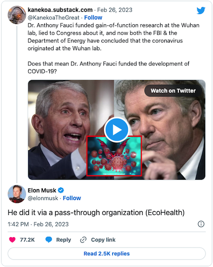 The cryptic warning came on a social media post by the state-run Global Times newspaper. The writer was reacting to Musk commenting on a tweet that mentioned the Department of Energy’s conclusion that COVID-19 originated at a lab in Wuhan, China. The original tweet, from the account “Kanekoa The Great,” questioned whether Dr. Anthony Fauci, former director of the National Institute of Allergy and Infectious Diseases, was involved in the development of COVID-19 because he had funded “gain-of-function research at the Wuhan lab.”