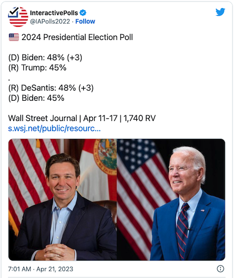 A new poll conducted for the Wall Street Journalby the polling firm run by Tony Fabrizio, the pollster for Donald Trump, finds Ron DeSantis leading Joe Biden by three points but Trump trailing Biden by three points:
