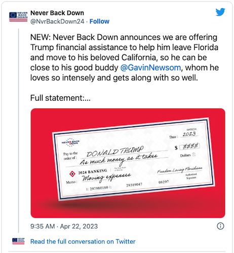 In response, a DeSantis PAC Trolled Trump following his latest targeted attacks on the governor, encouraging him to move to Democrat-run California if he thinks Florida is so bad. “Never Back Down announces we are offering Trump financial assistance to help him leave Florida and move to his beloved California, so he can be close to his good buddy @GavinNewsom, whom he loves so intensely and gets along with so well,” the PAC’s tweet read.