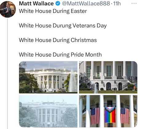 …clearly violated Section §7. (e) of the U.S. Flag Code, which unambiguously dictates, “The flag of the United States of America should be at the center and at the highest point of the group when a number of flags of States or localities or pennants of societies are grouped and displayed from staffs.” Can it really be no one advising this demented, old deviant understands the proprieties surrounding the display of Old Glory, or do they simply not care?!?