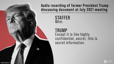 This is powerful and damning evidence that appears to be a smoking gun of sorts. Trump shows off documents that he admits were (a) drawn up by the US military, (b) not declassified because he no longer has the power to do so, and therefore (c) still secret. I’ll note that CBS has reported the document in question isn’t among the items Trump has been charged for unlawfully retaining, so I’d like to see an explanation for that. Again, though, Trump’s own words on the tape are what hurt him most. He said the military document was never declassified and still a secret. It seems entirely possible that the indictment’s summary of the audio transcript was handled in such a way as to set another trap for Trump, excluding just enough context and details as to allow the former president to dream up some lie or spin that might seen somewhat plausible to him, based on incomplete information. If that’s the case, Trump raced right into the trap, going on television with his half-baked defense. Then out comes the tape. It exposes Trump even further from a legal perspective, and inflicts additional political harm — even if the GOP base has decided none of this matters, or even somehow amounts to an imperative to nominate him again.