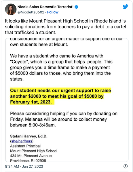 “He only owes $2000 out of the $5000, but if he does not pay that by February 1, they will kill his family in his country,” Harvey wrote in an email to colleagues obtained by Parents Defending Education, a nonprofit that advocates transparency in education. “We have a student who came to America with [a] ‘Coyote[.]’ [W]hen they come illegal, they usually give them a time frame to make a payment of $5,000 dollors [sic] to those, who bring them illegal.”