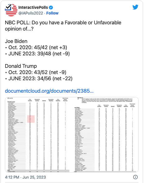 Here’s the juice in two parts. Part One, and be honest: Does anyone doubt for a minute Trump is lying through his teeth in the Baier interview? Think about it: According to the indictment, Trump was recorded bragging about possessing highly-classified documents on July 21, 2021; What news articles would have been printed back then about secret Military plans to attack Iran?!? Part Two: Trump may be guilty as Hell, but all it will take is one holdout on the jury for a mistrial. But then, the issue isn’t Trump’s guilt or innocence, rather it’s the impact his egregious conduct will have on voters. Any way you slice it, it can’t be positive.