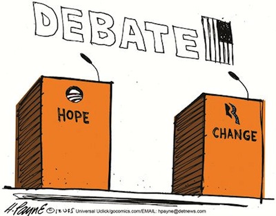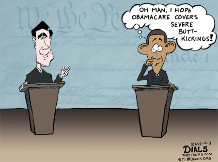 I’ve been watching presidential debates for quite a few years, but I have never seen one like this. It wasn’t a TKO, it was a knockout. Mitt Romney was in control from the beginning. He was the alpha male, while Barack Obama was weak, hesitant, stuttering, often apologetic. The visuals were great for Romney and awful for Obama. Obama looked small, tired, defeated after four years of failure, out of ammo. One small point among many: Obama doesn’t even know how to stand at a podium, as he continually lifted up one leg. He would be below average as a high school debater.