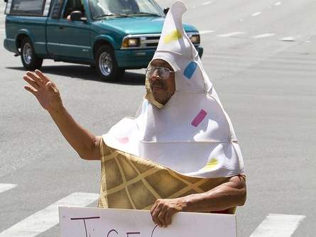 Once and for all, people, it’s an ice cream cone. The owners of Ice Cream Family Corner and Sandwiches at the busy intersection of South Pine Avenue and Southwest 17th Street say their two-month-old business is getting creamed because passers-by have mistaken their white-hooded ice cream cone mascot for a KKK protester.