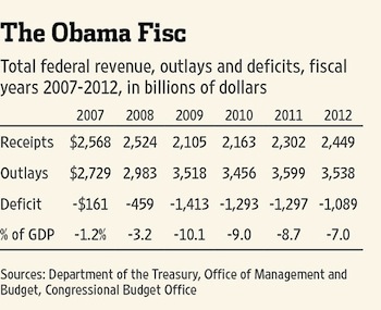 The nearby table lays out the ugly details. The feds rolled up another $1.1 trillion deficit for the year that ended September 30, which was the biggest deficit since World War II, except for each of the previous three years.President Obama can now proudly claim the four largest deficits in modern history. As a share of GDP, the deficit fell to 7% last year, which was still above any single year of the Reagan Presidency, or any other year since Truman worked in the Oval Office.
