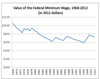 Since we’re on the subject of numbers, consider this graph from the Daily Kos, purportedly proving the inherent inadequacies of the current minimum wage: