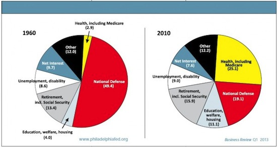 “…While about 50 percent of expenditures were devoted to national defense in the 1960s, most spending was devoted to welfare programs in 2010. Unemployment, Social Security, health, and education were just 28.9 percent of expenditures in the 1960s, but their size had increased to 61 percent by 2010. The composition of spending shifted from temporary to structural expenditures.”