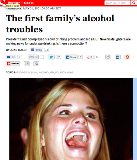 But consider this article that Mediaite discovered written by that same Joan Walsh written back in 2001, when the Bush daughters were caught drinking underage while in college.