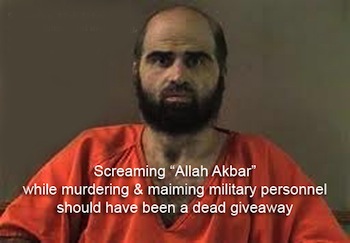 Yet there are clues that raise legitimate suspicions. Remember how the DoD refused to classify Nidal Malik Hasan’s attack as terorrism, referring to it instead as “workplace violence”? Remember how Janet Napolitano tried to re-name (Islamofascist) terrorism as “man-caused disasters”? Ever noticed how — as Charles Krauthammer points out — the President goes to comical links to avoid using any words that would even imply a connection between radical Islam and terrorism?