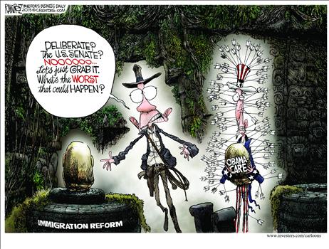 But Marco, I still have faith in you. (A faith we frankly don’t share!) I think your problem is naiveté – that you’re a nice guy who sees a very real problem, with very real human costs, and that you want to find a solution to it. However, human nature being what it is, you’ve become invested in the 844-page abomination that the rest of the Gang of Eight is determined to jam though before it can be disinfected with sunlight. So, you are stuck defending the indefensible.
