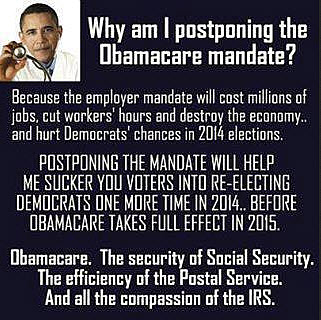 By postponing the employer mandate, Obama has given millions of Americans the legal standing to sue.