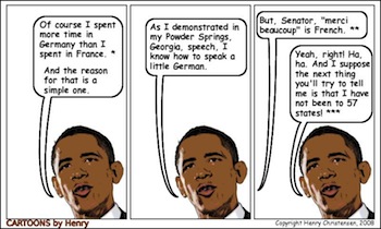 When in the state of Hawaii, Obama announced that he was in “Asia.” He lamented that the U.S. Army’s Arabic-language translators assigned to Iraq could better be used in Afghanistan, failing to recognize that Arabic isn’t the language of Afghanistan. And for that matter, he apparently thought Austrians speak a language other than German.