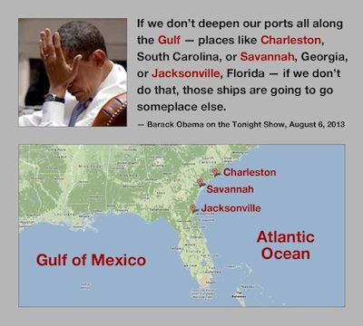 In the case of geography, Harvard Law School graduate Barack Obama recently lectured that, “If we don’t deepen our ports all along the Gulf — places like Charleston, South Carolina; or Savannah, Georgia; or Jacksonville, Florida …” The problem is that all the examples he cited are cities on the East Coast, not the Gulf of Mexico. If Obama does not know where these ports are, how can he deepen them?