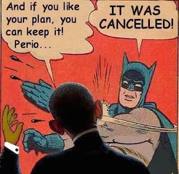 Due to the requirement for our stunningly-gorgeous-but-thankfully-infertile-wife to be provided free birth control and pregnancy coverage, our absolutely-adequate health insurance policy with Blue Cross/Blue Shield was cancelled.