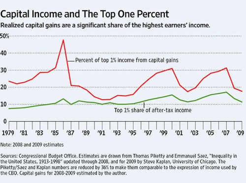 True enough, capital gains are not the whole story, and the CBO’s report, “Trends in the Distribution of Household Income Between 1979 and 2007,” notes that “business income was the fastest growing source of income for the top 1 percent.” But that too was a behavioral response to lower tax rates.