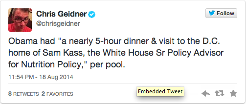 The world is literally burning, and, based on the White House’s own published schedule for The Obamao, the Partier-in-Chief spent TWICE as much time Monday night livin’ La Vida Loca than he spent on national security briefings that morning.