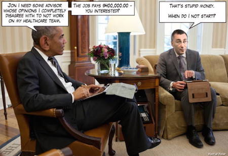 The memo writer also wasn’t being paid $400,000 by the Bush administration to make Iraq War policy. Jonathan Gruber was paid that much — plus another several million from the states — to design Obamacare. You don’t pay a half-million dollars to someone who is only peripherally involved in making policy. (Unless we’re talking about Obama himself.)