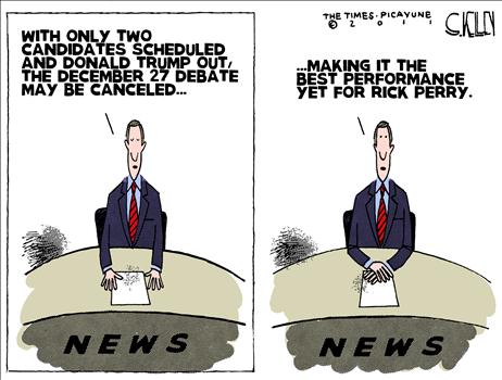 Now comes Mitt Romney. Is he a contender? That eternal 25% ceiling on him says no, not yet. For months, Mitt has been The Front-Runner, whatever the polls said. It’s hard to say that after last Saturday’s GOP debate.