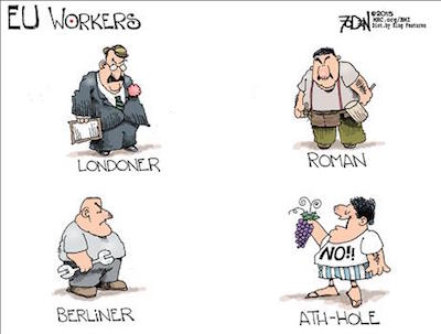…Tsipras assured the Greeks they were voting themselves better bailout terms. They are getting the opposite — if, indeed, they get anything. More than a few well-informed observers believe that the Germans have simply abandoned hope that the Greeks are capable of real reform or willing to engage in it, and that the Greek “No” vote was welcomed with a quiet sigh of relief, providing Angela Merkel et al. with a plausible excuse to scuttle further bailout efforts. The Greeks may have burned their bridge to Europe, but the Germans are roasting marshmallows over the flames…”