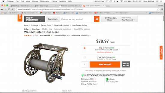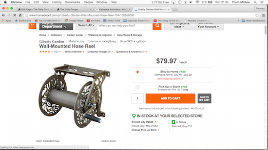 Our frustration only increased when the Eldersburg manager (a) didn’t offer any meaningful apology for our 25 minutes on hold, and (b) confirmed her store didn’t have any Liberty model #704 wall-mounted hose reels in stock either, her store’s computerized inventory control system notwithstanding.