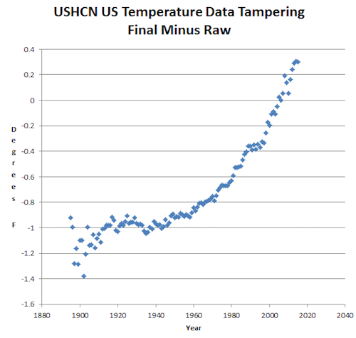 They accomplish this through a spectacular hockey stick of data tampering, which corrupts the US temperature trend by almost two degrees.