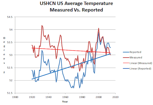 The measured US temperature data from USHCN shows that the US is on a long-term cooling trend. But the reported temperatures from NOAA show a strong warming trend.