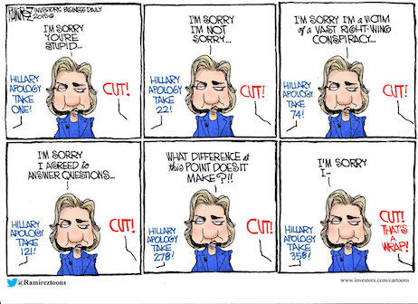 ““I’m sorry about that,” Hillary Rodham Clinton said six years after seizing control of government email and after six months of denying wrongdoing. Just this week, it took three different interviews in four days for her to beg the puniest of pardons: “I do think I could have and should have done a better job answering questions earlier.”