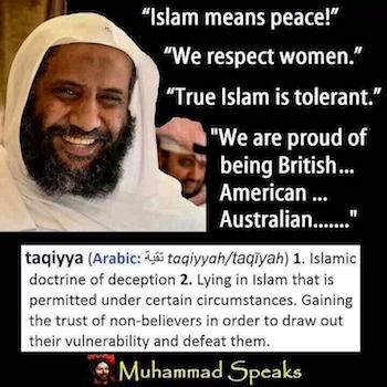 “Taqiyya is an Islamic doctrine that allows Muslims to deceive non-Muslims. As in lie to them. Dr. Sami Mukaram, author of Taqiyya in Islam, writes: “Taqiyya is of fundamental importance in Islam. Practically every Islamic sect agrees to it and practices it… Taqiyya is very prevalent in Islamic politics, especially in the modern era.” (Specific references to taqiyya in the Quran, the Hadith, and in Islamic law, can be found here.)