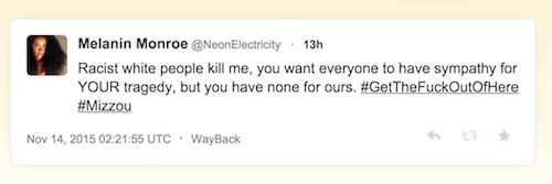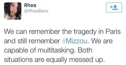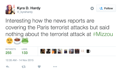 Black Lives Matter and Mizzou protesters responded to the murder of scores of people in Paris at the hands of Islamic extremists by complaining about losing the spotlight and saying their “struggles” were being “erased.” Their struggles, remember, consist of a poop swastika of unknown provenance and unsubstantiated claims of racially-charged remarks somewhere near Missouri’s campus.