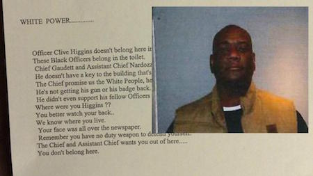 Former Officer Clive Higgins reported that he found a racist hate letter in his police mailbox the morning of Monday, Feb. 9 and feared for his life because of it. The letter, printed on paper marked with the department’s official letterhead, started off with “WHITE POWER” and went on to say “Officer Clive Higgins doesn’t belong here in this Police Department” and “These Black Officers belong in the toilet.”