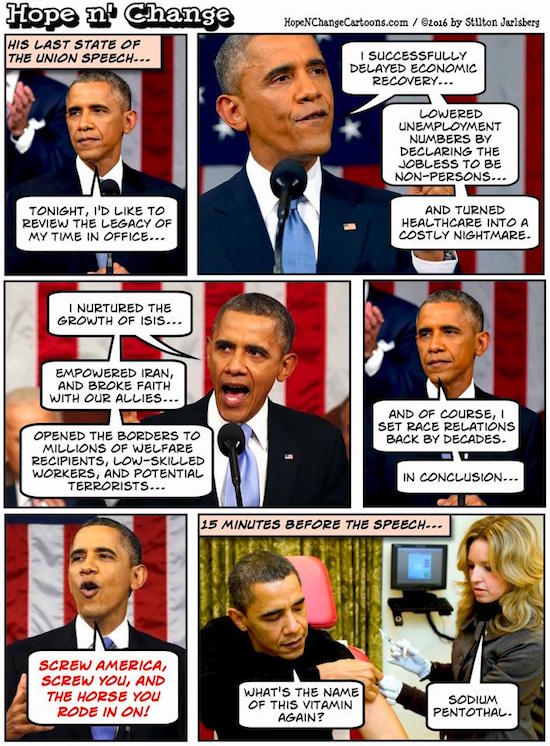 It’s Wednesday, January 13th, 2016…but before we begin, a couple of random thoughts on the passing scene. First, courtesy of Hope n’ Change, what The Dear Misleader would have said tonight were he somehow compelled to speak the truth: