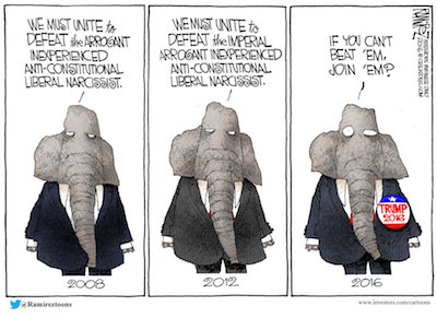 The Trump train is ostensibly fueled by anger at Washington’s various betrayals, and a rigged system that benefits insiders and elites at the expense of average Americans.But the billionaire’s bandwagon is more than happy to embrace card-carrying, central-casting members of The Establishment, so long as they’re saying or doing things that are deemed helpful to the ‘Trumpstablishment.’ Trump supporters angrily rail against Beltway fat cats who “go along to get along” in political fights, then prance from one lavish cocktail party to the next, toasting their own superiority. Then they’ll turn around and applaud bona fide establishment fixtures — from Rudy Giuliani, to Newt Gingrich, to Boehner and McConnell — while applying that now-meaningless term to conservatives who oppose Trump on policy and ideological grounds.