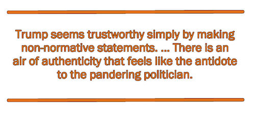 Aside from his dubious political loyalties, Trump persists in being mean-spirited. He seems uninformed on many of the issues, especially those in foreign policy; he changes positions, contradicts himself within a single speech, and uses little more than three adjectives (tremendous, great, and huge).But the problem with many of these complaints is that they apply equally to both the current president and the other would-be next president. When Hillary Clinton, playing to the green vote, bragged that she would put miners out of work, and then, when confronted with an out-of-work miner, backtracked and lied about her earlier boast, we had a refined version of Trump’s storytelling. The Clinton Foundation’s skullduggery and Hillary’s e-mail shenanigans seem to trump the Trump University con — and involve greater harm to the nation. Her combination of greedy Wall Street, for-profit schmoozing and paint-by-the-numbers progressivism is repulsive.