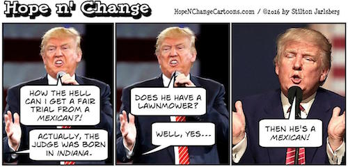 The problem with Donald Trump, though (let me rephrase: one of the inexhaustibly many problems) is that his personal beefs become the ideological framework for hundreds of thousands, perhaps millions, of(ignorant, angry or ill-informed)Americans. In this latest instance, for example, Trump has implied that no law can be interpreted disinterestedly and applied dispassionately. There’s really no such thing as reason; there are only inescapable tribal prejudices. Because his parents were from Mexico, Gonzalo Curiel is always going to be loyal first and foremost to Mexico, so he will never be able to render a fair decision on anything involving Donald Trump.