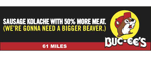 “…Buc-ee’s is an enthusiastic practitioner of the great American art of billboardery: “Restrooms you gotta pee to believe . . . Eat here, get gas . . . Only 262 miles to Buc-ee’s — you can hold it . . . ” and the simple Texas “Yee-Haw!”